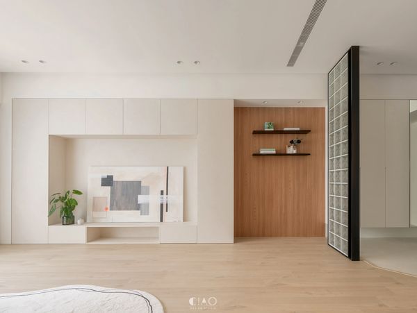 公共領域採開放式格局,電視主牆以特殊塗料強化整體質感。